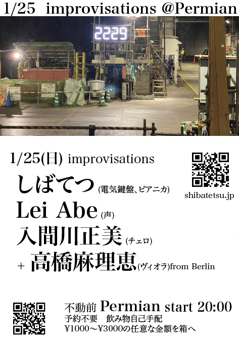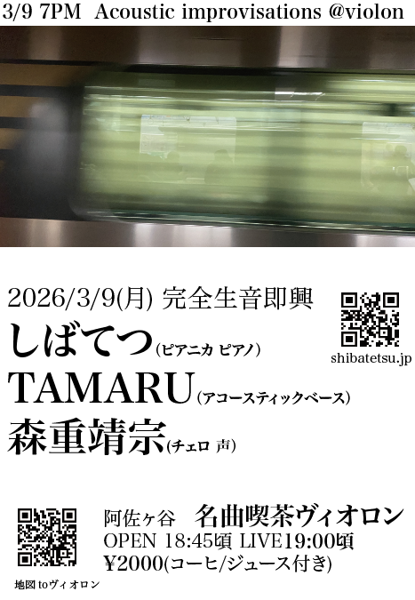 しばてつ (ピアノ、ピアニカ)入間川正美 (チェロ)イノスボクス (鎌田雄一sax動き + 森下雄介tp)狩俣道夫 (フルート、声)